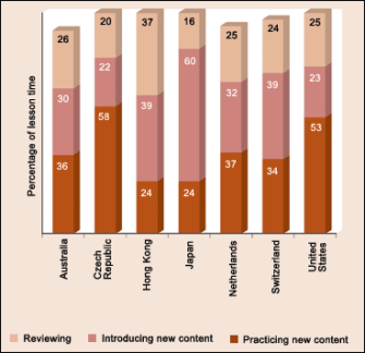The following shows the average percentage of lesson time devoted to reviewing, introducing new content, and practicing new content in 8th grade math classes.