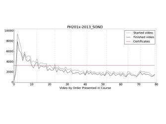 Course developers allocating scarce resources should consider carefully the utility of video, especially videos produced for the later weeks of a course. It may be that students learn more from activities and experiences than videos. I’m particularly interested in those activities, like simulations, formative peer assessment, and synchronous online discussion, that create learning experiences that students might not have in other contexts. When MOOC producers do invest in video, I’d encourage the bulk of that investment going into the very first few videos. Substantial more students watch the first few videos in a course than subsequent ones. I’d encourage video producers to focus most heavily on those opportunities to reach the majority of a course’s students.
