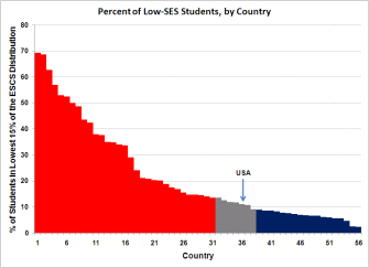 The figure below shows the percentage of 15-year-olds in each of the PISA countries and economies whose ESCS is in the bottom 15% of ESCS among students in OECD countries. Countries are arrayed from highest to lowest, and columns in red represent significantly higher percentages than the U.S. percentage of 11%; columns in blue represent significantly lower percentages than the U.S.; and grey columns are statistically indistinguishable from the U.S. Ten countries, headed by Thailand, Indonesia, Turkey and Tunisia, have more than 40% of the PISA participants in this low-ESCS category. Three countries—Norway, Iceland and Canada—have fewer than 5% in the low-ESCS category. Based on the ESCS scale, which is intended to be standardized across countries, there are many countries with higher concentrations of low-SES students than the U.S.