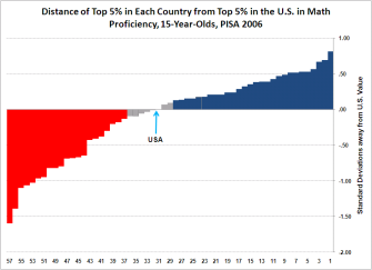 In mathematics, the performance of top U.S. students is dismal. In 28 countries, students at the 95th percentile score significantly higher than students at the 95th percentile in the U.S., and the gaps are surprisingly large. Students in Chinese Taipei, Korea, Hong Kong, Switzerland, Finland, Belgium, the Czech Republic and Liechtenstein all score at least .5 standard deviations above the U.S. in this comparison.