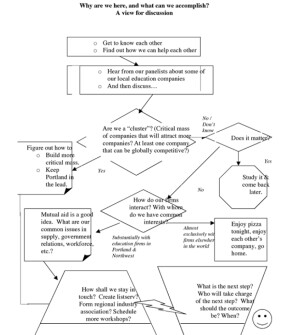 Another example of where the Cluster still needs to grow is in creating an overall direction. At the first meeting back in 2003, Fred Phillips, then Dean of the Oregon Graduate Institute’s management school, presented a diagram suggesting how the Cluster could grow and issues we might address in the education market. (See below). His ideas are still true today but I sometimes worry that we are still lacking a common goal. One idea that we have explored is having the cluster create a sort of buying consortium where the power of all the businesses can be leveraged. This has been hard to tackle. Just last month, we were offered a nice reduced price on one service an organization was offering but the cluster could not get together to make it happen. The members of the cluster are a diverse group – providing tools to the pre-K market, school districts and adult education so it is hard to find one idea that works for all members.