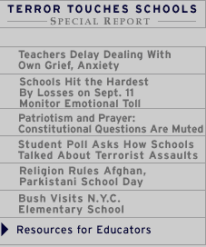 A number of organizations offer information and guidance for educators and parents about how to help students cope in the aftermath of the attacks on the World Trade Center and the Pentagon. Here is a sampling of what’s available on the Web: