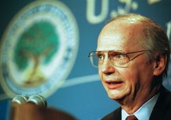 | Secretary of Education Richard W. Riley calls for more “dual immersion” and early-intervention programs last week during his first comprehensive speech on the state of Hispanic education. —Benjamin Tice Smith |