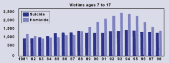 The suicide rates of juveniles ages 7 to 17 increased from the early to the late 1980s, and then remained relatively consistant for most of the 1990s, in contrast to juvenile-homicide trends. Between 1981 and 1994, suicides increased 44 percent, while homicides rose 82 percent.