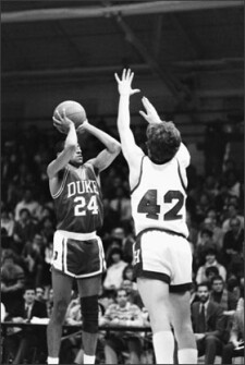 Duke University’s Johnny Dawkins, left, shoots despite the efforts of Harvard’s Arne Duncan, during first half action on February 8, 1984 at Harvard.