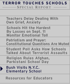 Mr. Bush praised the heroism of the school’s teachers, who shepherded their pupils to safety in the minutes after two jets slammed into the trade center’s twin towers. He told the children that their teachers loved them, and he urged them to share their worries about the attacks with their teachers.