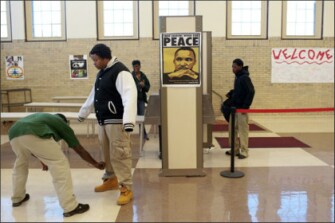 Photo: A student passes through security at the beginning of the school day at Christian Fenger Academy High School in Chicago. School officials around the country are working to balance school security with the need to maintain a positive learning environment. —Peter Hoffman for Education Week