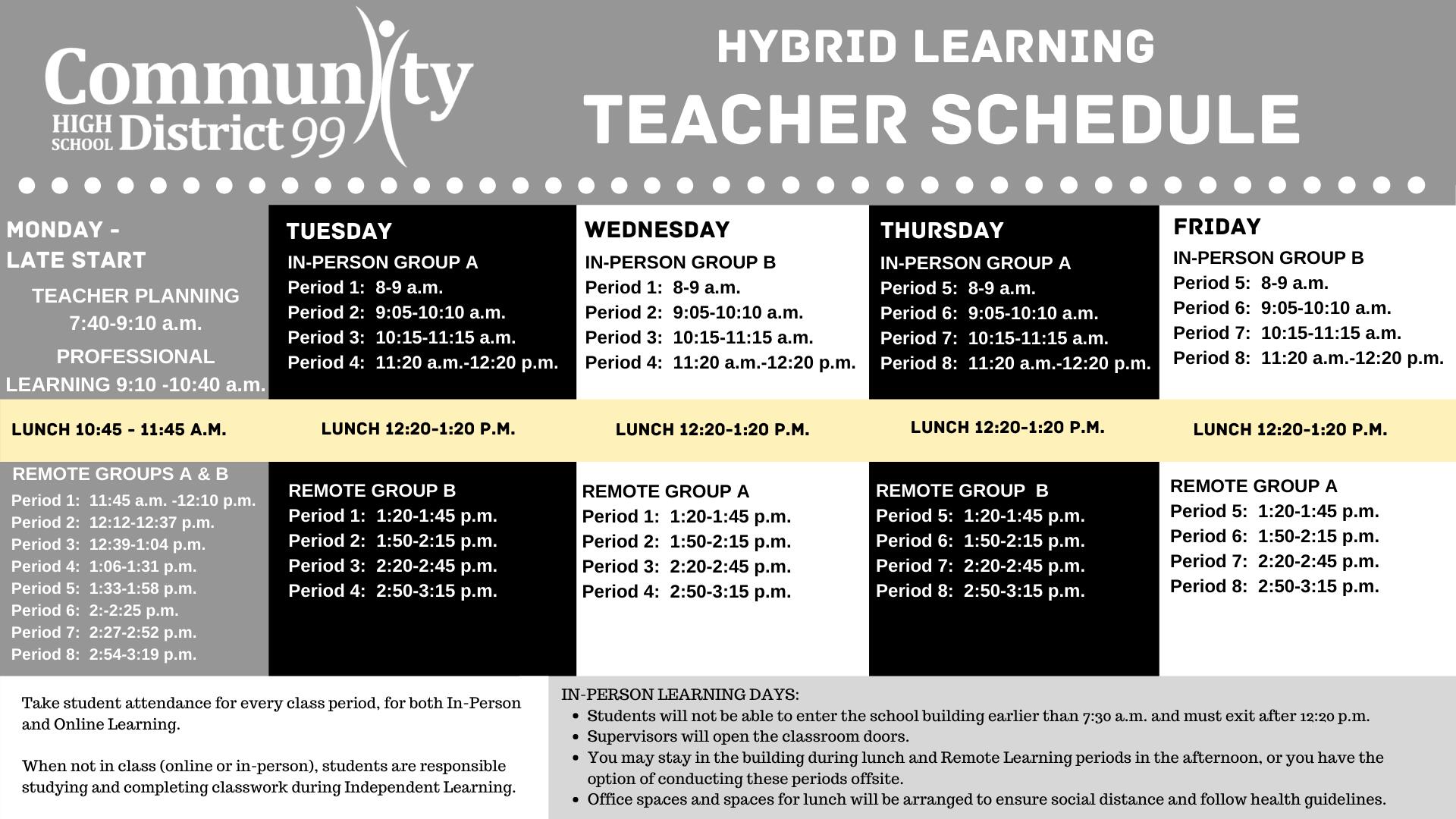 Janice Schwarze, the principal of North High School in Downers Grove, Ill., said the two high schools in her district built their hybrid schedules to ensure that their 5,000 students get daily class sessions with teachers; it jettisoned the idea of class connections only two or three times a week. Teachers will start the week with planning and professional development Monday mornings, then spend the afternoon in 25-minute remote check-in periods with all their classes. The rest of the week, they’ll alternate between one-hour class sessions in-person and 25-minute sessions online.