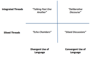 From these two analyses, we propose a two-by-two matrix to summarize possible dimensions of engagement across difference in online discussion forums, shown in Figure 1. The bottom left quadrant includes forums where people with different political beliefs separate into different network clusters and use different language; these are the echo chambers of Internet discourse. The top left quadrant includes integrated threads where partisans use different language; these are spaces where students with different beliefs talk past one another. In the bottom right quadrant, students with different political beliefs discuss topics using a shared language, but they divide themselves into conversational siloes with like-minded others. In the top right quadrant is our hypothesized ideal condition of deliberative discourse, where people with diverse beliefs engage in discussion using a common vocabulary.