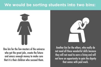 Consider what the educator might have to do if this vision of automated life comes to pass. We would be sorting students into two bins, one bin for the few masters of the universe who get the great jobs, create the future and amass enough money to make sure that it is their children who succeed them and not the children of the others who are not as fortunate as they to be in the driver’s seat when the ball got rolling. And then there will be the bin for the others, who really do not need all those wonderful skills that the masters of the universe need, because they will not need to earn a living and will not have an opportunity to gain the dignity that comes with paid work.