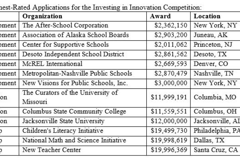The latest round of federal Investing in Innovation grants includes projects to work on better high school outcomes and college readiness.