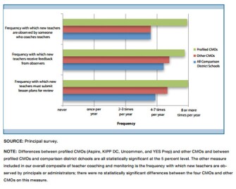 The following chart shows the extent to which the CMOs identified as effective observe teachers in action, offer them feedback and review lesson plans, compared with other charters and traditional public schools: