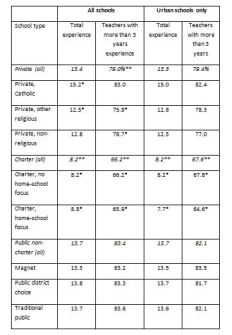 Cannata, who culls data from the federal Schools and Staffing Survey, finds that charter schools, both in urban and non-urban areas, employ a smaller percentage of teachers with more than three years of experience on the job than do both regular public and private schools:
