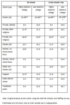 Many non-religious private schools, on the other hand, serve a relatively affluent population of parents who assume that their children are bound for elite colleges, Cannata suggested in an e-mail. As a result, leaders of those non-sectarian schools may be more inclined to place an emphasis on hiring teachers from the most selective colleges, she says. (If readers have an alternate explanation for the disparity between Catholic and non-Catholic private schools in this area, feel free to send them along.)