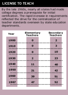 By the early 1900s, states had begun to assert significant control over teaching. The local practices of the 19th century--in which school districts issued teaching permits on the basis of examinations--gave way to a system that closely entwined licensure and teacher education.