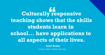 My personal experiences with culturally responsive teaching and its benefits began in my first year of teaching: I began my career as an English teacher at an urban middle school in Brooklyn, N.Y., and quickly found culturally responsive teaching to be an essential component of effective English instruction. My students further understood writing strategies through the analysis of song lyrics they identified, enhanced their awareness of characterization through their understandings of local dialects, and developed their critical-thinking skills while reflecting on the importance of community events. These instructional practices gave me firsthand confirmation of what research says about the importance of culturally responsive teaching: Making these connections to my students’ home lives and communities helped them master academic skills and strategies and see their work in school as related to their out-of-school lives.