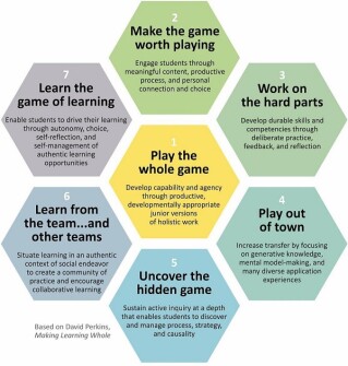 When it came to developing tools and guidance for educators to develop learning designs, the MyWays team was drawn to David Perkins’s Making Learning Whole framework because it highlights and integrates the elements that are particularly critical to the development of the broader and deeper outcomes that MyWays embodies. Perhaps most importantly, Perkins’s central message of “playing the whole game” (see #1 in the center of the graphic below) is perfectly aligned with the essential role of learners as active players in holistic experiences that carry meaning and require commitment (i.e., involve the “whole game”).