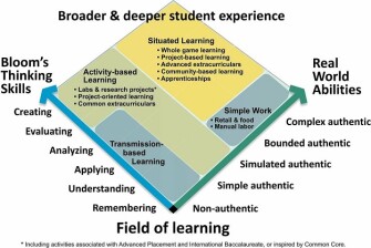 Notice the golden rectangle of Situated Learning, which includes PBL along with community-based education, apprenticeships, and other authentic learning modalities. In this sweet spot, higher-order thinking skills are engaged within real world settings that are either bounded (within a controlled setting, or with some variables held constant) or complex (unbounded). This is learning that is embedded in activity, context, and culture, where social interaction and collaboration are essential, and novices learn from those more expert until they eventually become expert themselves--all key ingredients for developing the competencies needed by students today.