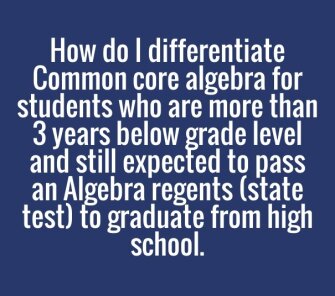 How do I differentiate Common core algebra for students who are more than 3 years below grade level and still expected to pass an Algebra regents (state test) to graduate from high school? My students receive one 45 minute math class a day and no resource room.