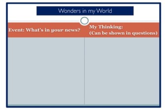 I use this chart (adapted from National Louis University professor James Beane’s book, Curriculum Integration) to model what is in my news and what I may be struggling with understanding better. Then, I turn it over to the students and have them do the same in a Think, Pair, Share with a partner.