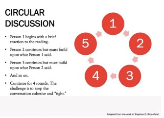 I adapted this protocol from Stephen Brookfield’s book, The Discussion Book: 50 Great Ways to Get People Talking (which I highly recommend!). Like the They Say, I Say protocol, Student A begins by sharing her opinion of the text. Student B must then respond by directly connecting to what Student A has already shared. Then Student C connects to Student B, and so on. Again, students must actively listen. I ask students to try to repeat this process for four rounds, which challenges students to broaden and deepen their conversation. Hint: It’s helpful to have a time limit for each student (30-60 seconds ) to keep the conversation moving.