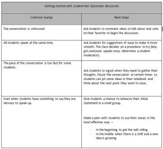 Here are some common bumps that occur when shifting to student-led classroom discussions and some possible next steps that keep the discussion anchored by the thoughts and words of the students. Good luck!