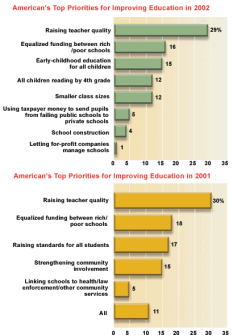 In the first PEN-Education Week poll, conducted in 2001, 30 percent of the respondents chose raising teacher quality as their top priority, and 18 percent picked equalizing school funding. The poll project is part of an ongoing effort to gauge public support for public education.
